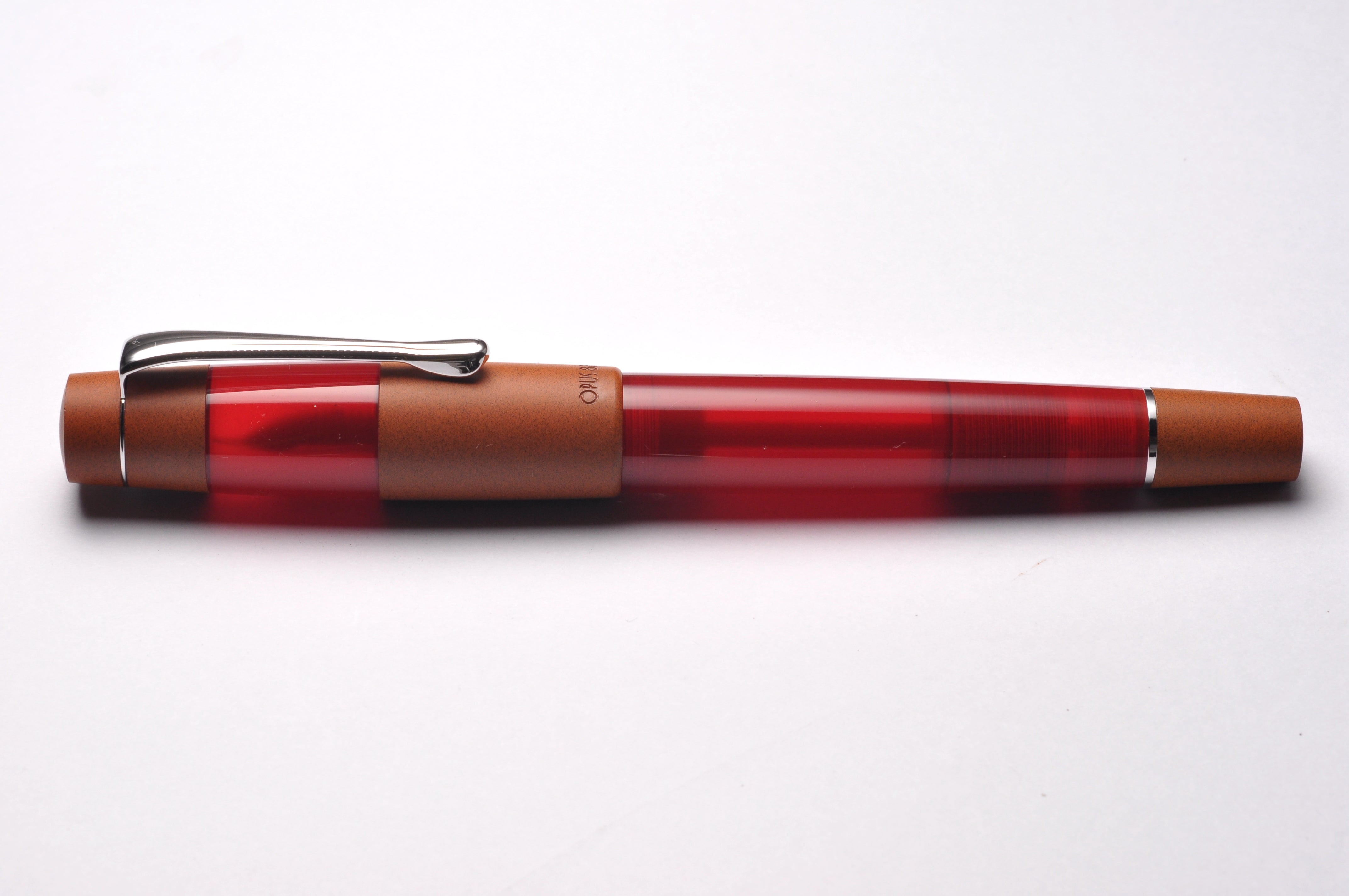 Eine recht unbekannte Marke in Europa ist Opus 88. Diese taiwanesische Firma produziert allerdings schon seit 1971 Füllhalter, meist mit sehr aufwendiger Urushi-Bemalung und auch im Auftrag von namhaften japanischen Schreibgeräteherstellern. Mit dieser Kenntnis hat sich Opus 88 jetzt daran gemacht, einen sehr modernen, aber mit klassischen Materialien gefertigten Füllhalter zu produzieren. Herausgekommen ist dabei der Opus 88 Koloro. Wie alle Füllhalter aus dem Hause Opus 88 ist auch dies ein Eyedropper, also ein Füllhalter, den man direkt mit Tinte mittels eine Pipette füllt. Dadurch hat er ein sehr großes Fassungsvermögen für Tinte (deutlich über 3 ml). Um gleichzeitig das Auslaufen der Tinte zu vermeiden, hat der Koloro einen recht einfachen Mechanismus: direkt vor dem Tintenleitwerk ist eine Dichtung, die mittels eines Schraubgewindes bewegt werden kann: Dreht man am hinteren Ende des Füllhalters das Gewinde auf, so entfernt man diese Dichtung und die Tinte kann ungehindert fliessen. Dreht man das Gewinde wieder zu, so ist das Tintenleitwerk abgedichtet und man kann nur noch wenige Worte schreiben.
